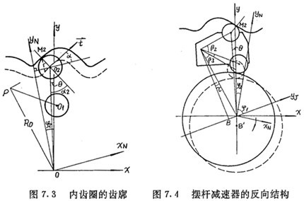 和推桿減速器一樣,當(dāng)理論擺動(dòng)機(jī)構(gòu)數(shù)目比內(nèi)齒圈齒數(shù)少,即ZC=ZN-1時(shí),機(jī)構(gòu)成為圖7.4所示的反向結(jié)構(gòu),在此結(jié)構(gòu)中,擺桿外滾子中心在與內(nèi)齒圈固聯(lián)的