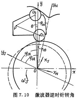 圖7.2(a)所示為激波器與擺動(dòng)機(jī)構(gòu)所處的初始位置,此時(shí)擺桿內(nèi)滾子與偏心圓激波器的短軸端點(diǎn)相切接觸。O是激波器的回轉(zhuǎn)中心,P是擺桿的擺動(dòng)中心,O