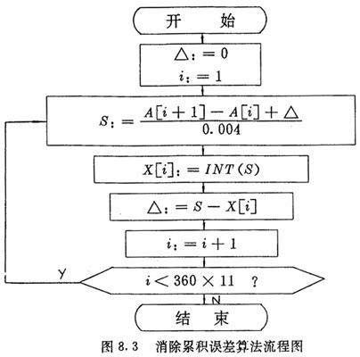 用式(4.4)及式(4.5)計(jì)算nx和nc時(shí),得到的不可能恰好是整數(shù),為了消除累積誤差,每段中應(yīng)把上一段的誤差考慮進(jìn)去。例如對nx的計(jì)算,假定表8.1中Pd的360×11個(gè)數(shù)已存在數(shù)組A中,計(jì)算后的360×11-l個(gè)脈沖數(shù)nx存在數(shù)組x中,則計(jì)算過程如圖8.3所示。