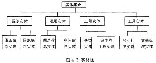 在面向?qū)ο蟮?SPAN lang=EN-US>CAD集成開(kāi)發(fā)系統(tǒng)里,系統(tǒng)數(shù)據(jù)模型的基本元素就是ARX開(kāi)發(fā)語(yǔ)言中的(多是C/C++語(yǔ)言)類(lèi),類(lèi)實(shí)例化后稱為對(duì)象或?qū)嶓w,整個(gè)圖紙就是一個(gè)實(shí)體集合,主要由四大塊組成:圖紙實(shí)體集合、通用實(shí)體集合、工程實(shí)體集合和工程實(shí)體集合。其中,圖紙實(shí)體、通用實(shí)體和工具實(shí)體都為獨(dú)立類(lèi),沒(méi)有父類(lèi)或子類(lèi);而工程實(shí)體集合中的各工程實(shí)體是由具有基本特征的基類(lèi)實(shí)體派生而來(lái),具有一個(gè)基類(lèi)和若干個(gè)派生類(lèi),并且各實(shí)體集之間互相獨(dú)立(如圖4-3所示)