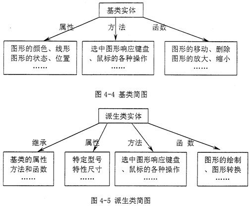 在上面所說(shuō)的四種實(shí)體里,圖紙實(shí)體、通用實(shí)體、工具實(shí)體都是一些簡(jiǎn)單實(shí)體,基本上是對(duì)一些AutoCAD的操作命令進(jìn)行集成,使之能夠?qū)こ虒?shí)體進(jìn)行操作,并且符合不同行業(yè)的命名規(guī)則。而最復(fù)雜的是工程實(shí)體,首先,每個(gè)行業(yè)中工程實(shí)體的種類(lèi)繁多,必須進(jìn)行細(xì)致有序的分類(lèi),使之符合行業(yè)習(xí)慣;其次,確定基類(lèi)與派生類(lèi)之間的關(guān)系,有效地定義基類(lèi)的各個(gè)屬性、方法和函數(shù),便于擴(kuò)充派生類(lèi);最后,要完整的定義每一個(gè)工程實(shí)體的所有的屬性、方法和函數(shù),特別重要的是,要很好地利用AutoCAD已提供的所有信息資源。對(duì)于以上的問(wèn)題,第一,要對(duì)行業(yè)的需求十分清晰,能夠?qū)π袠I(yè)中涉及到的工程實(shí)體進(jìn)行歸納,要具有“面向?qū)ο蟆钡木幊趟季S;第二,基類(lèi)涉及的屬性方法和函數(shù)基本上與實(shí)體圖形的操作有密切關(guān)系(如圖4-4所示);派生類(lèi)主要涉及到工程實(shí)體的特征屬性、特征方法和特征函數(shù)(如圖4-5示),完整地定義其基類(lèi)和派生類(lèi)是“面向?qū)ο蟮?SPAN lang=EN-US>CAD集成開(kāi)發(fā)系統(tǒng)”中的核心部分;第三,要充分的利用AutoCAD已提供的資源,主要就是要利用AutoCAD系統(tǒng)中的*,dwg文件的圖形文件數(shù)據(jù)庫(kù)中的資源,熟悉各種AutoCAD中實(shí)體(例如點(diǎn)、直線、圓弧等)的DXF碼規(guī)則,并從中提取相關(guān)特征信息;第四,由于在AutoCAD中的.dwg文件中,存儲(chǔ)的是一些簡(jiǎn)單的幾何的點(diǎn)、直線、圓、弧等信息,故還需要另一個(gè)文件去記錄整個(gè)圖紙的工程實(shí)體圖形的邏輯關(guān)系(下一節(jié)詳細(xì)介紹),隨同*.dwg文件的打開(kāi)而打開(kāi),標(biāo)識(shí)*.dwg文件圖形中的實(shí)體圖形邏輯關(guān)系,隨同*.dwg文件的關(guān)閉而記錄*.dwg文件中的實(shí)體圖菜邏輯關(guān)系。