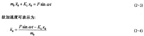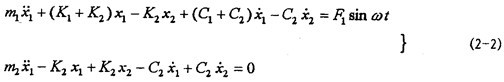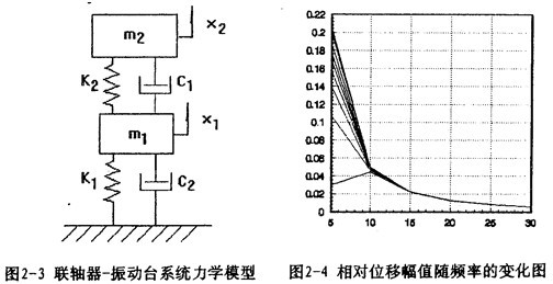 對(duì)應(yīng)的力學(xué)模型如圖2-3(見22頁)所示,式中m1為振動(dòng)臺(tái)動(dòng)圈、聯(lián)軸器外套及固定在振動(dòng)臺(tái)上夾具的質(zhì)量;m2為聯(lián)軸器內(nèi)套、芯軸及配重的質(zhì)量;K1為振動(dòng)臺(tái)支撐動(dòng)圈部分的剛度系數(shù),K2為聯(lián)軸器彈性元件的剛度系數(shù);C1為振動(dòng)臺(tái)動(dòng)圈阻尼系數(shù);C2為聯(lián)軸器