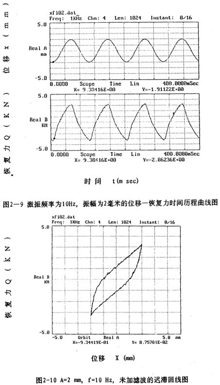 信號(hào)處理時(shí),將磁帶記錄儀記錄的五路振動(dòng)信號(hào)經(jīng)磁帶記錄儀回放,愉出到數(shù)據(jù)采集板(A/D板)進(jìn)行五路振動(dòng)信號(hào)(恢復(fù)力、位移、速度、加速度信號(hào))同步采樣和A/D轉(zhuǎn)換,然后輸出到PC386微機(jī)存人磁盤,該數(shù)據(jù)采集系統(tǒng)采集的數(shù)據(jù)都是以二進(jìn)制形式存儲(chǔ)的文件。為了計(jì)算和閱讀方便,需將二進(jìn)制數(shù)據(jù)文件轉(zhuǎn)換成ASC碼文件,然后再編程進(jìn)行數(shù)據(jù)處理.對(duì)處理后形成的數(shù)據(jù)文件進(jìn)行作圖可以形成許多相應(yīng)的曲線圖,圖2-6至圖2-13是眾多曲線中的一部分。