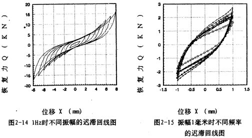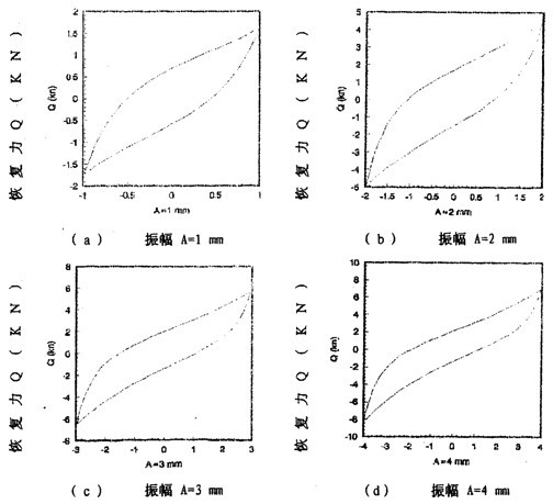 圖2-9(見26頁)表示激振頻率為1OHz,振動(dòng)位移幅值為±2毫米的位移和恢復(fù)力時(shí)間歷程圖,圖2-10(見26頁)、圖2-11(見27頁)為對(duì)應(yīng)的遲滯回線圖。圖2-l2(見27、28頁)表示激振頻率為IHz,振動(dòng)位移幅值分別為±(1-8)毫米的位移一恢復(fù)力圖,圖2-14(見29頁)則為圖2-12的合圖,由圖2-14同頻率不同振幅的八條遲滯回線分析可知,大撓度剛絲繩彈性聯(lián)軸器的動(dòng)剛度與振動(dòng)幅值有關(guān),同時(shí),從遲滯回線面積(表示聯(lián)軸器阻尼所耗散的能量)可知聯(lián)軸器的阻尼與振動(dòng)幅值也有關(guān),即聯(lián)軸器的動(dòng)剛度和阻尼均是振幅的非線性函數(shù)。