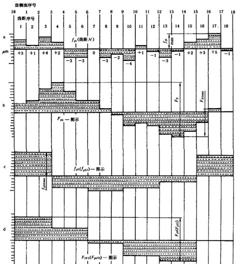 當(dāng)各齒通過嚙合時(shí),單個(gè)齒距偏差在切向綜合位移圓弧上有累積作用。這種影響在切向綜合偏差圖上看得很清楚,這樣,可確定齒距累積偏差值,(比如k=2.3,…)即在適當(dāng)數(shù)量的齒距間測頂點(diǎn)切線的縱坐標(biāo)。圖28中表示了單個(gè)齒距偏差、單個(gè)齒距和齒廓組合偏差以及近似的齒距累積總偏差。