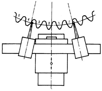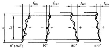 取在直徑上對(duì)置的同側(cè)位置的齒面,從其螺旋線圖上可以獲得適用的平均值,然而,如螺旋線傾斜偏差沿齒輪圓周變化時(shí),則必須至少取三個(gè)均布齒面的跡線。否則其偏差不一定能被發(fā)現(xiàn)。