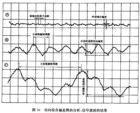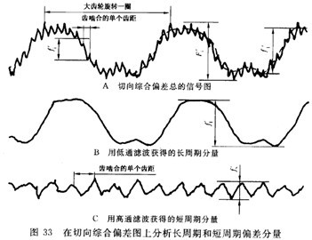 重要的事是記住,在濾掉長周期分量后,一齒切向綜合偏差fi′(圖33A)實(shí)際上變小了,這樣真正的最大偏差fi′就未必能在經(jīng)濾波后的短同期分量的曲線(圖33C)中表示出來。