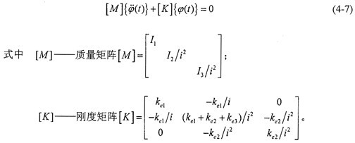 在分析和評價減速器系統(tǒng)扭振特性時,需要計算系統(tǒng)的各階固有頻率以及相應(yīng)的主振型,這就要求解系統(tǒng)的無阻尼自由振動方程。當(dāng)系統(tǒng)自由振動時,激振力矩和阻尼均為零,此時系統(tǒng)的動力學(xué)方程可表示為