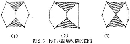 對于(5,5)來說,只有一種連接方式,作為一種混合動力驅動系統(tǒng)已有人做過研究,在本論文中,不能滿足設計要求,因此不可取;而(9,11)及以上又有40個(或更多)運動鏈之多,且構件多結構復雜,研究起來非常困難,暫不考慮;先考慮(7,8)七桿八副機構,其構建數量不是太多,結構不是太復雜,共有3個運動鏈(如圖2-5),特定化后又有11種(排除同構的機構)特定化導出機構,可以從中選擇可能適合的方案,因此以下將對(7,8)來詳細分析研究。