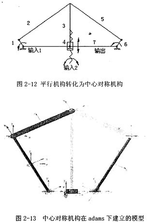 這種平行桿機構理論上正確,但是實際上運行時會產生奇異,不能實際采用,因此轉化為如圖2-12所示的這種中心對稱的連桿機構。并在adams軟件下建立了模型如圖2-13,經分析認為該機構完全對稱的結構特征,更適合于一般情況下的速度等速傳遞,不適合在沖壓工況下應用,所以這種結構也決定不采用。