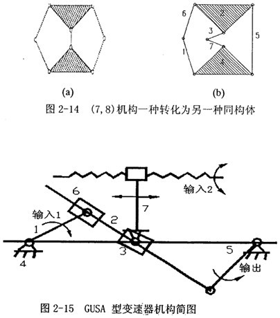 方案三:在眾多已有機構類型篩選當中,發(fā)現(xiàn)機構式脈動無級變速器中的一種:三相并列連桿式(GUSA)脈動無級變速器采用的機構可以供鑒。這咱變速器設計原理為:采用三相并列結構,作為輸入機構的是相位差為120度的三曲拐曲軸,每個曲拐帶動一套Ⅲ級七桿機構,如圖所示是(7,8)圖譜中(1)的一種同構機構,圖2-14顯示了它的轉化和各桿件的標號,可以與圖2-15結構簡圖——對應。