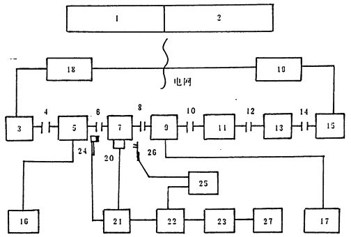 試驗時,通過控制臺1,2調(diào)節(jié)控制系統(tǒng)讓交直流機組18發(fā)出適當(dāng)?shù)闹绷麟妷菏怪绷鳒y功機3(工作于恒速電動工況)按恒定轉(zhuǎn)速轉(zhuǎn)動,通過聯(lián)軸器4,6和輸入轉(zhuǎn)速扭矩傳感器5與試件7輸放端(高速端)相聯(lián)接。試件7輸出端通過聯(lián)軸器8,10,12,14及輸出扭矩傳感受器9、升速用11、汽車變速箱13而與直流測功機15(工作于恒電流工況)聯(lián)接,驅(qū)使其發(fā)出適當(dāng)電壓的直流電,再通過交直流機組19將其逆變成為工頻北流電返回電網(wǎng),完成整個電功率封閉閉鏈。