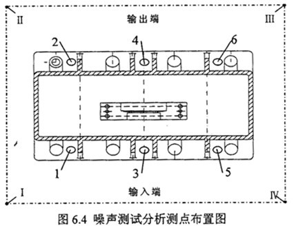 結(jié)構(gòu)振動(dòng)噪聲測(cè)試在齒輪箱安裝基腳布置6個(gè)測(cè)點(diǎn),測(cè)點(diǎn)布置圖見(jiàn)圖31-6測(cè)點(diǎn),在每一測(cè)點(diǎn)上按31.5Hz5kHz1/3倍頻中心頻率測(cè)試加速度級(jí)頻譜(re:a0=10-6m/s)和1/3倍頻中心頻率測(cè)試速度級(jí)頻譜(re:a0=5*10-8m/s)?諝庠肼暅y(cè)試聲壓級(jí)基準(zhǔn)2*10-5Pa,用聲級(jí)計(jì)上的A計(jì)權(quán)聲壓級(jí)和1/1倍頻程聲壓級(jí)測(cè)量減速齒輪裝置各個(gè)測(cè)點(diǎn)。各測(cè)點(diǎn)距齒箱測(cè)量表面的距離為1米。測(cè)點(diǎn)位置見(jiàn)測(cè)點(diǎn)布置圖6.4中Ⅰ-Ⅳ測(cè)點(diǎn)。