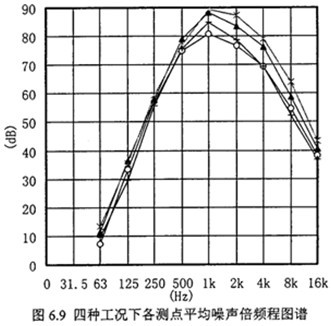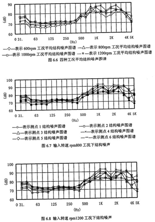 5)從圖6.9空氣噪聲倍頻程圖譜可以看出,隨著轉(zhuǎn)速升高在小于1000Hz時(shí)空氣噪聲倍頻程幅值變化不大,但大于1000Hz5000Hz時(shí)變化較明顯,這與減速器的嚙合頻率或嚙合頻率倍數(shù)成份上的振動(dòng)幅值較大有很大關(guān)系。