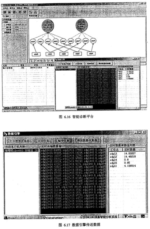 綜上分析,采用人機(jī)交互方式將Zdp14、Zdp15等參數(shù)輸入計(jì)算機(jī),智能診斷系統(tǒng)得到雙環(huán)減速器故障診斷結(jié)果,偏心軸彎曲故障,程度值在01范圍變化,齒形誤差較大。智能診斷結(jié)果如圖6.15所示。圖6.16是智能診斷平臺(tái)進(jìn)行現(xiàn)場(chǎng)一線(xiàn)診斷分析,圖6.17是數(shù)據(jù)引擎進(jìn)行實(shí)時(shí)數(shù)據(jù)接收和數(shù)據(jù)發(fā)送。