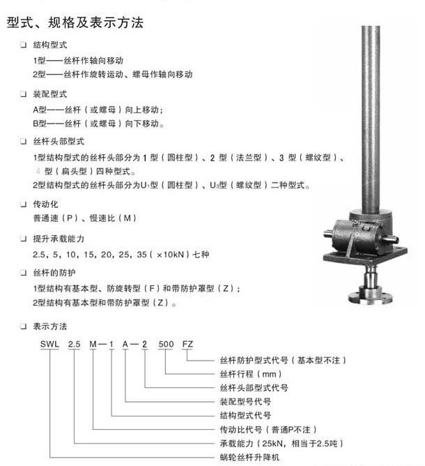 絲杠升降機廣泛應用于機械、冶金、建筑、水利設(shè)備等行業(yè),具有起升、下降及借助輔件推進、翻轉(zhuǎn)及各種高度位置調(diào)整等諸多功能.SWL蝸輪絲杠升降機是一種基礎(chǔ)起重部件,具有結(jié)構(gòu)緊湊、體積小、重量輕、動力源廣泛、無噪音、安裝方便、使用靈活、功能多、配套形式多、可靠性高、使用壽命長等許多優(yōu)點?梢詥闻_或組合使用,能按一定程序準確地控制調(diào)整提升或推進的高度,可以用電動機或 其他動力直接帶動,也可以手動。它有不同的結(jié)構(gòu)形式和裝配形式,且提升高度可按用戶的要求定制。 。該裝置可以自鎖