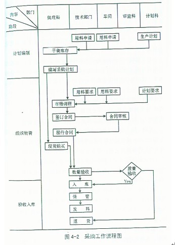 第四步競購。由進入競購范圍的供應(yīng)單位或個人向供應(yīng)科提交申報單,載明:所競購物資名稱、產(chǎn)地、規(guī)格、數(shù)量、質(zhì)量、價格、交貨期、供應(yīng)渠道、售后服務(wù)等,一式兩份呈報物管辦和供應(yīng)科公開進行競購。供應(yīng)科根據(jù)生產(chǎn)供應(yīng)計劃和所掌握的最低競價,選定2~3家為供貨單位,報物管辦備查。最后由供應(yīng)科與供貨單位簽訂合同,具體實施物資采購進廠。 競購成功并簽訂合同的供貨單位須按合同要求,及時、保質(zhì)保量地供貨。若中途違約或物資使用過程中發(fā)現(xiàn)內(nèi)在質(zhì)量問題而造成損失、影響生產(chǎn),則按規(guī)定承擔(dān)違約責(zé)任。凡違約或質(zhì)量問題影響生產(chǎn)兩次以上者,一律取消其競購資格。 全程監(jiān)控 為明確各方面責(zé)任,公司從提出用料申請、編制物資采購計劃開始,到驗收入庫、生產(chǎn)使用為止,制定了詳細的業(yè)務(wù)流程,所有環(huán)節(jié)一律按工作程序進行全程管理。詳見圖4—2采購工作流程圖。 成本管理科將上述流程活動中所涉及的各類信息資料如原輔材料的價格、質(zhì)量、數(shù)量、供貨單位及聯(lián)系人、責(zé)任人等輸入微機,隨時進行查詢、分析、全程追蹤監(jiān)控。