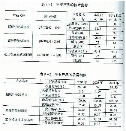 公司董事長張國林提出并率先在泰星減速機(jī)股份有限公司全面推行的以“三改、三制、三化”為主線的一系列的管理理念、管理模式、管理方法、運(yùn)行機(jī)制和創(chuàng)新機(jī)制,不僅對公司的內(nèi)部管理產(chǎn)生了巨大的成效,取得了很好的企業(yè)效益,且得到了社會的廣泛認(rèn)可,產(chǎn)生了很好的社會效應(yīng)和一定的理論效應(yīng)。 I 推動企業(yè)發(fā)展 創(chuàng)造了超一流的產(chǎn)品 泰星減速機(jī)股份有限公司正是認(rèn)真貫徹了公司董事長張國林的“一保產(chǎn)品質(zhì)量,二保供貨期”的質(zhì)量思想,在企業(yè)員工中形成了一種“用戶在我心中、質(zhì)量在我手中、用戶的需求就是我們的追求、用戶滿意才有我們的滿意”的質(zhì)量共識,為用戶提供了國內(nèi)領(lǐng)先、國際一流的高質(zhì)量的產(chǎn)品。 泰星產(chǎn)品的高質(zhì)量體現(xiàn)在:代表主要產(chǎn)品質(zhì)量水平的主要技術(shù)指標(biāo)遠(yuǎn)遠(yuǎn)超過了同行業(yè)的最佳水平。見表8—1。 主要產(chǎn)品的質(zhì)量指標(biāo)遠(yuǎn)遠(yuǎn)超過了國內(nèi)的最好水平。主要產(chǎn)品的質(zhì)量水平見表8—2。 到2004年泰星減速機(jī)股份有限公司的產(chǎn)品合格率連續(xù)11年達(dá)到100%,一等品率2004年達(dá)到95.3%,優(yōu)等品率達(dá)到72.50%。 泰星公司生產(chǎn)的產(chǎn)品噪音低,無污染,環(huán)境指標(biāo)達(dá)到了國內(nèi)的同行業(yè)的領(lǐng)先水平。  增強(qiáng)了研發(fā)能力 公司董事長張國林認(rèn)識到:“技術(shù)創(chuàng)新是企業(yè)發(fā)展的關(guān)鍵。沒有先進(jìn)的技術(shù),先進(jìn)的設(shè)備和工藝,就不可能生產(chǎn)出質(zhì)量過硬的產(chǎn)品,企業(yè)也無法立足于市場,擴(kuò)大規(guī)模,企業(yè)發(fā)展也就成為一句空話”。因此,董事長張國林非常重視企業(yè)科技開發(fā)工作,一方面,不斷加大公司的科技研發(fā)費(fèi)用的投人,早在2000年泰星減速機(jī)股份有限公司的研究與開發(fā)費(fèi)用已經(jīng)占到公司當(dāng)年銷售收入的9.7%,遠(yuǎn)遠(yuǎn)超過了國內(nèi)同行業(yè)企業(yè)的先進(jìn)水平,已經(jīng)接近國外大型跨國公司10%的最好水平,泰星股份公司的研究與開發(fā)費(fèi)用還在以每年20%的速度在增長;另一方面,為了提高企業(yè)的技術(shù)研發(fā)能力,泰星股份公司于1998年初就成立了減速機(jī)研究所,研究所取得了豐碩的科研成果,他們自主設(shè)計(jì)、自主研制、自主開發(fā)的9000系列擺線釷輪減速機(jī)、9000系列硬齒面減速機(jī)、9000系列中硬齒面減速機(jī)達(dá)到了國際21世紀(jì)先進(jìn)水平。 營造了整潔的工作環(huán)境 泰星股份公司董事長張國林認(rèn)為:一方面,優(yōu)美的廠區(qū)環(huán)境,是企業(yè)領(lǐng)導(dǎo)層富有戰(zhàn)略眼光的重要反映,也是企業(yè)形象和職工精神面貌的綜合體現(xiàn)。它有利于避免因外部環(huán)境干擾而引起的不良心理和生理現(xiàn)象,激發(fā)職工的勞動熱情,提高勞動生產(chǎn)率;另一方面,公司的員工每天要在公司工作八個(gè)小時(shí),公司、工廠、車間的環(huán)境美化了,能為員工營造一個(gè)舒適的工作環(huán)境,保證員工心情愉快,使員工處在一種愉悅的工作狀態(tài)中,這樣也有利于產(chǎn)品質(zhì)量的提高。因此,按照定制工藝的要求,本著使人機(jī)物處于最佳優(yōu)化組合狀態(tài)的原則,對公司的各個(gè)部門,車間內(nèi)部進(jìn)行了合理的平面布置,并重點(diǎn)抓了“兩通”“三化”工程建設(shè),不僅保證了車間內(nèi)的工作環(huán)境清潔、整齊,且使整個(gè)廠區(qū)布局合理、美麗、整潔。難怪國外的 同行來星股份公司考察時(shí),發(fā)出了這樣的贊嘆:“簡直就是一座花園式的工廠”。 形成了愛廠如家的工作熱情 沒有工作制度,沒有任何約束,員工自愿一天為企業(yè)工作14個(gè)小時(shí)。這種工作熱情在目前的市場經(jīng)濟(jì)社會中是罕見的。泰星公司員工的這種工作熱情來源于張國林董事長提出的“能上能下,競爭上崗:實(shí)績計(jì)酬”,“生活溫暖化”等一系列管理理念、管理方法在太星中的推行張董事長的這些管理理念與管理方法的實(shí)施,在企業(yè)內(nèi)部為員工們創(chuàng)造了一種發(fā)揮自己的才能,發(fā)揮自已的水平:一切憑實(shí)績講話,~切憑數(shù)據(jù)講話的氛圍。讓員工們也感受到了為企業(yè)工作的甜頭,感受到了他們的切身利益是與企業(yè)的榮辱:興衰密不可分的。因此,員工們愿意也樂意為企業(yè)工作。 創(chuàng)造了領(lǐng)先同行業(yè)十年的輝煌業(yè)績 由于董事長張國林治企有方,使泰星公司得到了快速的發(fā)展。在1993年,衡量公司經(jīng)濟(jì)效益的主要指標(biāo):資金利潤率、銷售利潤率、成本費(fèi)用利潤率、總資產(chǎn)貢獻(xiàn)率、流動資金周轉(zhuǎn)率、全員勞動生產(chǎn)率:產(chǎn)品銷售率、質(zhì)量損失率、新產(chǎn)品產(chǎn)值率以及萬元總產(chǎn)值綜合能耗均保持在全國同行業(yè)的領(lǐng)先水平。 在2003年泰星股份公司的主要經(jīng)濟(jì)效益指標(biāo)分別為:總資產(chǎn)零獻(xiàn)率為29.25%,資本保值增值率127.83%,資金周轉(zhuǎn)率2.64次,成本費(fèi)用利潤17.33%,全員勞動產(chǎn)生產(chǎn