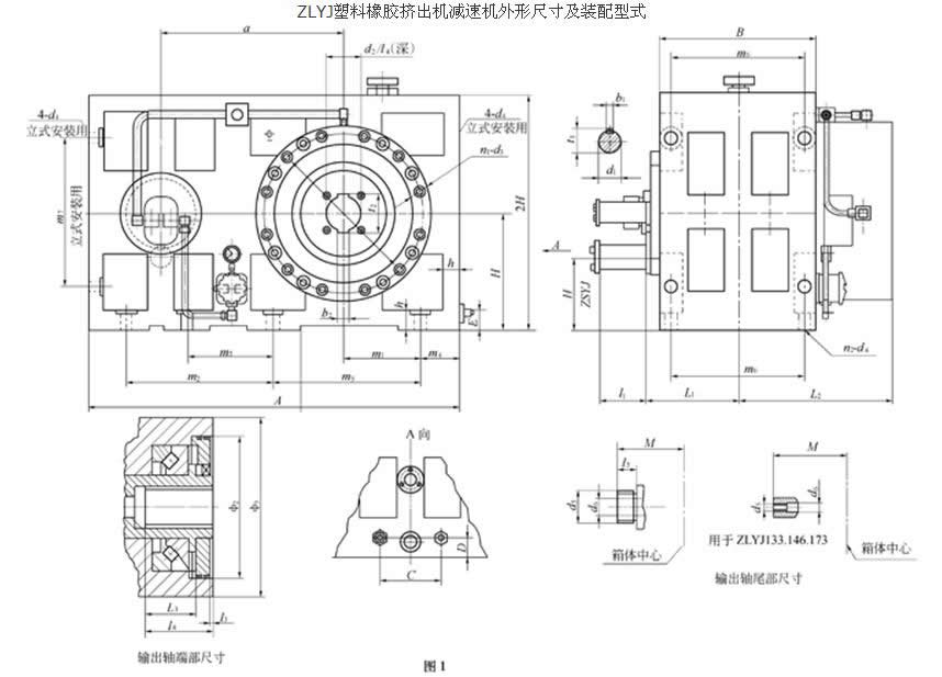 適用條件 1、減速機(jī)高速軸轉(zhuǎn)速不大于1500r/min。 2、齒輪傳動(dòng)圓周速度不大于20m/s。 3、工作環(huán)境溫度為-40~+45℃。如果低于0℃,啟動(dòng)前潤(rùn)滑油應(yīng)預(yù)熱至0℃以上,當(dāng)溫度超出規(guī)定時(shí),可按用戶要求,另行配置潤(rùn)滑加熱或冷卻裝置。本減速機(jī)可用于正反兩個(gè)方向運(yùn)轉(zhuǎn),但部分機(jī)型高速軸帶單向油泵,默認(rèn)方向?yàn)椋好鎸?duì)輸出軸,輸出軸為順時(shí)針旋轉(zhuǎn)。如方向改變,請(qǐng)?jiān)谟嗀洉r(shí)說(shuō)明。 本機(jī)廣泛應(yīng)用在單螺桿擠出機(jī):塑料管材、板材機(jī)組、吹膜機(jī)組、造顆粒機(jī)組、電纜機(jī)組、注塑機(jī)組等。橡膠擠出機(jī)。以及食品擠出機(jī)械。 花鍵、方孔、六方孔以及出軸頭的方頭、圓頭等(需要訂做)規(guī)格φ2(H7) l3 φ3 d4 n2 m1 m2 m3 m4 m5 m6 m7 C D E d5 d6 l5 M ZLYJ112 160 8 210 14 4 96 326 50 136 170 M16 18 125 ZLYJ133 180 8 230 16 6 104 185 185 61 180 184 M18 20 137 ZLYJ146 200 8 260 16 6 118 190 235 72 210 210 85 38 ZG1/2″ M18 20 167 ZLYJ173 230 8 300 18 6 113.5 220 220 68 225 214 m20 25 167 ZLYJ200 270 8 350 18 6 150 275 275 100 290 310 120 40 m85*4 40 50 250 ZLYJ225 330 8 420 26 6 165 310 310 90 315 330 140 50 55 265 ZLYJ250 330 8 420 26 6 205 360 360 105 330 340 160 50 285 ZLYJ280 360 8 450 30 6 200 385 385 100 355 380 160 50 300 ZLYJ315 365 8 450 30 6 260 450 450