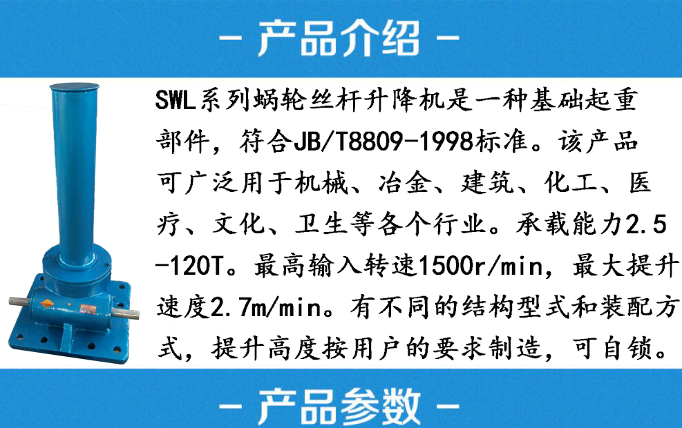 SL系列蝸輪絲桿升降機是一種基礎起重部件,符合JB/T8809-1998(原JB/Z04391-86)標準。該產(chǎn)可廣泛用于機械、冶金、建筑、化工、醫(yī)療文化衛(wèi)生等各個行業(yè)。承載能力2.5—120T。具有結構緊湊、積小、重量輕、動力源廣泛、無噪音、安裝方便、使用靈活、功能多、配套形式多、可靠性高、使用壽命長許多優(yōu)點。具有提升、降落、推進、翻轉(zhuǎn)等多種功能,可以單臺或組合使用,能按一定程序準確地控制調(diào)整升或推進的高度,可以用電動機或其它動力直接帶動,也可以手動。最高輸入轉(zhuǎn)速1500r/min,最大提升速2.7m/min。有不同的結構型式和裝配方式,提升高度按用戶的要求制造。該裝置可以自鎖。