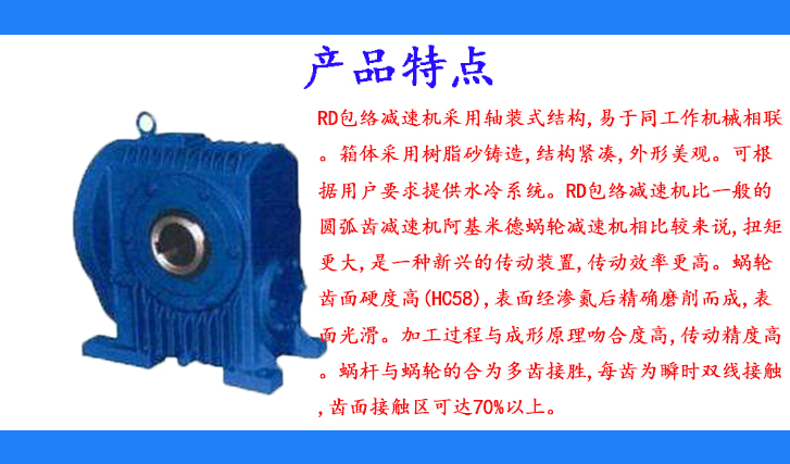 RD包絡(luò)減速機采用軸裝式結(jié)構(gòu),易于同工作機械相聯(lián)。箱體采用樹脂砂鑄造,結(jié)構(gòu)緊湊,外形美觀?筛鶕(jù)用戶要求提供水冷系統(tǒng)。RD包絡(luò)減速機比一般的圓弧齒減速機阿基米德蝸輪減速機相比較來說,扭矩更大,是一種新興的傳動裝置,傳動效率更高。蝸輪齒面硬度高(HC58),表面經(jīng)滲氮后精確磨削而成,離,面光滑。加工過程與成形原理吻合度高,傳動精度高。蝸桿與蝸輪的合為多齒接勝,每齒為瞬時雙線接觸,齒面接觸區(qū)可達70%以上!霎a(chǎn)品規(guī)格RD包絡(luò)減速機具體型號有RD-11-7.5,RD-11-10,RD-11-12.5,RD-4-240,RD-5.5-200,RD-5.5-280