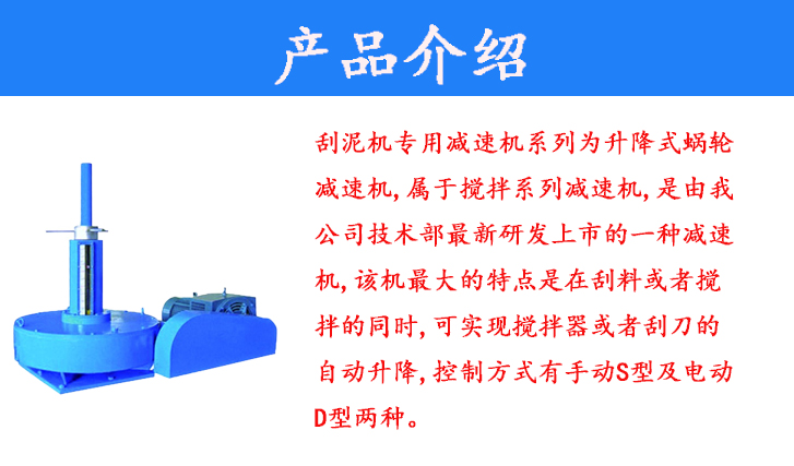 刮泥機專用減速機系列為升降式蝸輪減速機,屬于攪拌系列減速機,是由我公司技術部最新研發(fā)上市的一種減速機,該機最大的特點是在刮料或者攪拌的同時,可實現(xiàn)攪拌器或者刮刀的自動升降,控制方式有手動S型及電動D型兩種。