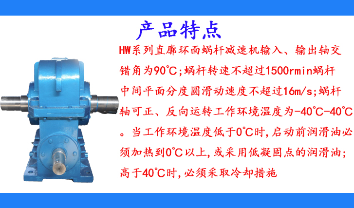 HW系列直廓環(huán)面蝸桿減速機輸入、輸出軸交錯角為90℃;蝸桿轉(zhuǎn)速不超過1500rmin蝸桿中間平面分度圓滑動速度不超過16m/s;蝸桿軸可正、反向運轉(zhuǎn)工作環(huán)境溫度為-40℃-40℃。當工作環(huán)境溫度低于0℃時,啟動前潤滑油必須加熱到0℃以上,或采用低凝固點的潤滑油;高于40℃時,必須采取冷卻措施
