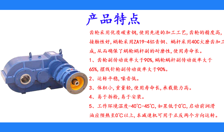 齒輪采用優(yōu)質(zhì)碳素鋼,使用先進的加工工藝,齒輪的精度高,接觸性好,蝸輪采用ZA19-4鋁青銅、蝸桿采用40C火磨齒加工而成,從而確保了蝸輪蝸桿副的耐磨性,使用壽命長。