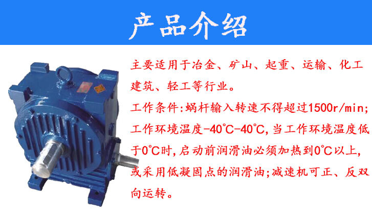 主要適用于冶金、礦山、起重、運(yùn)輸、化工、建筑、輕工等行業(yè)。工作條件:蝸桿輸入轉(zhuǎn)速不超過1500r/min;工作環(huán)境溫度為-40~40℃,當(dāng)工作環(huán)境溫度低于0℃時,啟動前潤滑油必須加熱到0℃以上,或采用低凝固點(diǎn)的潤滑油;減速器可正、反雙向運(yùn)轉(zhuǎn)。
