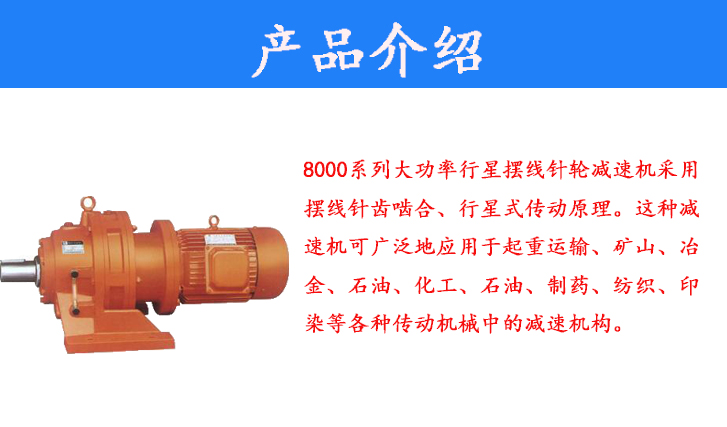 8000系列大功率行星擺線針輪減速機采用擺線針齒嚙合、行星式傳動原理。這種減速機可廣泛地應用于起重運輸、礦山、冶金、石油、化工、石油、制藥、紡織、印染等各種傳動機械中的減速機構(gòu)。