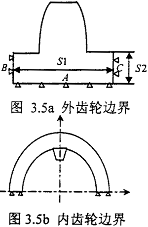 其內(nèi)齒的邊界范圍如果齒圈的厚度很薄時(shí)為了記及齒圈的變形取半個(gè)齒輪,如圖3.5b所示: