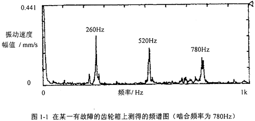 齒輪在傳動過程中,輪齒是不斷地處在一齒與兩齒交替咬合狀態(tài),對于斜齒輪,是不斷地處在兩齒與三齒交替咬合狀態(tài)。當齒側有間隙時,此時的振動體系是時變的非線性系統(tǒng);輪齒間隙過大時還會出現(xiàn)瞬時脫齒狀態(tài)。因此,齒輪所產生的振動除了和輪齒嚙合剛度時變性有關外,還和齒輪的制造誤差(如質量偏心、齒距偏差和齒形誤差)、裝配不良(如兩個齒輪軸心線不平行)、齒輪正常損傷(如齒輪正常磨損等)和齒輪非正常損傷(如齒面疲勞點蝕、齒面剝落、齒面燒傷、塑性變形和膠合撕傷等)有關。人們一般都認為,齒輪在振動時其振動故障頻率為齒輪嚙合頻率的n倍(n=l,2,3,…),但實際情況并不完全如此,如在圖1-1中,齒輪振動故障頻率為齒輪嚙合頻率的1/3、2/3和3/3倍,振動速度的幅值也較齒輪正常時大一些;在另外一些場合,齒輪振動故障頻率為n/m倍(n,m皆為正整數(shù))。因此很有必要對產生分數(shù)倍亞諧和超諧振動的原因作深入的研究工作。