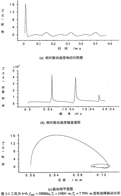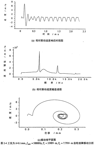 圖2-4是工況為:齒輪嚙合頻率為5888Hz、但齒側(cè)間隙b=0.1mm=Sn。(齒厚)齒輪故障振動(dòng)分析,其中(a)圖為齒輪輪齒相對(duì)振動(dòng)速度時(shí)程響應(yīng)圖,(b)圖為齒輪輪齒相對(duì)振動(dòng)速度幅值譜圖。從圖上可看出,當(dāng)齒側(cè)間隙增加到O.lmm時(shí),此時(shí)振動(dòng)故障頻率仍為齒輪嚙合頻率fmeh的1、2、3倍。相平面圖也穩(wěn)定于一個(gè)封閉曲線(見(c)圖)。