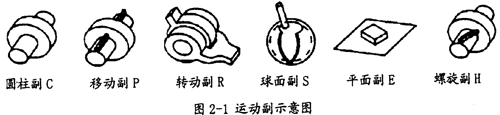 在等角速萬向聯(lián)軸器中,大部分都屬于連桿機(jī)構(gòu).最古老的雙聯(lián)十字軸萬向聯(lián)軸器機(jī)構(gòu)就是球面四連桿機(jī)構(gòu)。從大量的不同的機(jī)構(gòu)綜合中,有可能得出多種實(shí)用的等角速連桿機(jī)構(gòu),所以研究等角速理論,以連桿機(jī)構(gòu)的型式和尺度關(guān)系為對(duì)象,進(jìn)行新的等角速理論的探索,在一定的意義上是可行的。在機(jī)構(gòu)學(xué)上,構(gòu)件同構(gòu)件間的連接稱為副,其不同的形式和代號(hào)如圖2-1所示: