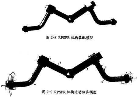 在圖2-8所示模型的基礎(chǔ)上,通過在各構(gòu)件間加上運(yùn)動(dòng)副,在運(yùn)動(dòng)副上施加運(yùn)動(dòng)驅(qū)動(dòng),即可得到此機(jī)構(gòu)的運(yùn)動(dòng)仿真模型(如圖2-9所示)。在此模型的建立過程中嚴(yán)格保證各構(gòu)件的共面,其運(yùn)動(dòng)副的形式同圖2-2中的RPSPR機(jī)構(gòu)均相同。這樣在此模型中有4個(gè)構(gòu)件(不含機(jī)架)、有2個(gè)旋轉(zhuǎn)副、有2個(gè)移動(dòng)副、有l(wèi)個(gè)球面副、模型有l(wèi)個(gè)自由度,再加上l個(gè)運(yùn)動(dòng)驅(qū)動(dòng)即可得到完整的仿真模型。不過此模型并不滿足鏡面機(jī)構(gòu)的條件。