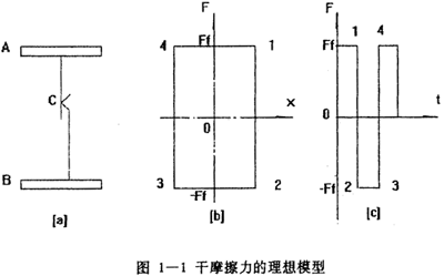 雙線性模型是非線性遲滯系統(tǒng)模型中最簡單的一種,而且也是最為久遠(yuǎn)的模型,對于它的初始機(jī)理研究最早可追溯到三十年代的Deo Hartog,他在研究干摩擦?xí)r提出了干磨擦的理想模型,他認(rèn)為在一個具有干摩擦面的單自由度系統(tǒng)中,干摩擦力隨相對滑移位移的關(guān)系可用一矩形來表示,如圖1-1所示。當(dāng)該系統(tǒng)受到外力激勵發(fā)生運(yùn)動時,干摩擦力總是與運(yùn)動速度反向而且阻礙運(yùn)動,進(jìn)而耗損系統(tǒng)的能量,從時域的角度看,干摩擦力的波形為矩形波,Den Hartog還按能量耗散相等原理,把理想干摩擦等效成粘性阻尼。實(shí)際上干摩擦交界面,在外力小于摩擦力時,兩邊就有變形,隨著外力的增加,此變形隨之增大,這是因?yàn)榻唤缑鎯蛇叺奈镔|(zhì)有一定的彈性。即使兩邊有較大的滑移時,交界面上的干摩擦力仍然不是常數(shù),而是隨振幅的增大而緩慢上升的。Earlestes等人對此作了描述,認(rèn)為一旦交界面有了滑移,干摩擦的線性力不是常數(shù)(4Ffπ),而是與相對位移X有關(guān),從Ff變到4Ff/π,表達(dá)式為