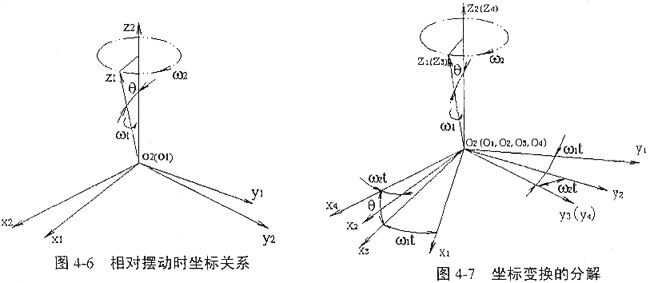 把以上的相對(duì)擺動(dòng)具體化,考慮兩坐標(biāo)系的變換,在靜坐標(biāo)系S2中觀察,整個(gè)S1坐標(biāo)系只有2個(gè)自由度,即S1分別繞z1軸的自轉(zhuǎn)和繞z2軸的公轉(zhuǎn)。在交角不變的情況下兩坐標(biāo)系的關(guān)系可用圖4-6表示。