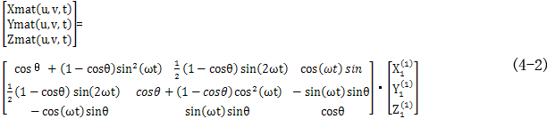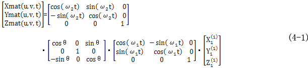 這種相對(duì)擺動(dòng)的結(jié)果形成一個(gè)直齒面的包絡(luò)面,在直齒面擺動(dòng)的任何位置,兩者都共軛線接觸。利用兩坐標(biāo)系的幾何關(guān)系和空間坐標(biāo)變換,直齒面在靜坐標(biāo)系中形成的曲面族可用下式表示為