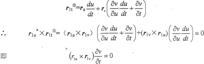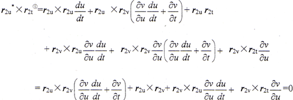 為了使上述向量方程變?yōu)闃?biāo)量方程,使等式兩端點(diǎn)積以r2u×r2v(≠0),并按拉格朗日恒等式展開,整理后得