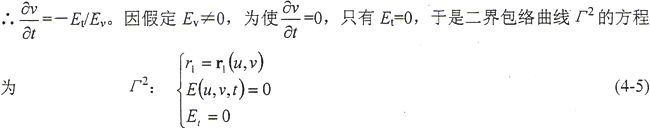 兩偏導(dǎo)數(shù)不能同時(shí)為零。因?yàn)槿绻瑫r(shí)為零,說(shuō)明包絡(luò)條件中沒(méi)有變數(shù)u、v,這時(shí)t只能等于常數(shù),代入第一式,只能得到曲面族中的某一曲面,而不存在包絡(luò)線。