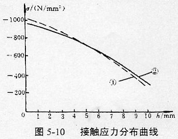 基于上述接觸問題的有限元與邊界元計(jì)算模型和前面的載荷分析,對一模數(shù)m=5mm、齒數(shù)Z=40、分度圓壓力角a=20°、分度圓直徑d=200mm、齒寬b=20mm、齒輪材料的彈性常數(shù)E=2.1×105N/mm2、泊松比μ=0.3、傳遞扭矩Mn=300N·m的共軛鼓形齒聯(lián)軸器鼓形齒輪Ⅰ進(jìn)行了接觸應(yīng)力計(jì)算,其簡圖如圖5-9所示。該問題接觸應(yīng)力的有限元與邊界元數(shù)值解和接觸應(yīng)力分布曲線分別如表5-1、圖5-10所示。曲線①(虛線)為接觸應(yīng)力的有限元解;曲線②(實(shí)線)為接觸應(yīng)力的邊界元解。