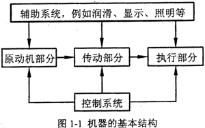機器的發(fā)展經(jīng)歷了一個由簡單到復雜的過程,人類為滿足生產(chǎn)及生活的需要,設(shè)計和制造出了種類繁多、功能各異的機器。機器類型多種多樣,基本結(jié)構(gòu)可以歸結(jié)為如圖1-l所示。機器的功能各異,所要求的運動形式千變?nèi)f化,并且需要克服的阻力、阻力矩也因機器工作情況而異。一般說來,原動機的運動形式、運動及動力參數(shù)都是有限的,而且是確定的。這樣必須解決把原動機的運動形式、運動及動力參數(shù)轉(zhuǎn)變?yōu)閳?zhí)行部分所需的運動形式、運動及動力參數(shù)的問題。這就必須靠機器的傳動部分來完成,即機器中的傳動部分是機器為完成各種功能所必需的基本構(gòu)成。