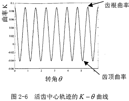 (1)由圖2-6中K-θ曲線可以看出,中心輪每一個(gè)齒在齒根處曲率最大,曲率半徑最小。沿著齒廓上升的過程中曲率減小到零后,繼續(xù)減小為負(fù)值。到達(dá)齒頂時(shí),曲率最小。