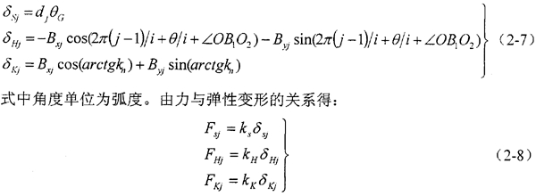 考慮變形協(xié)調(diào)條件,設(shè)第j個(gè)活齒的接觸變形量分別為δHj,δKj和δSj,導(dǎo)致活齒中心與旋轉(zhuǎn)中心O的連線OB1轉(zhuǎn)過微小角度θG,反映在坐標(biāo)系中,就是活齒中心B在水平和垂直兩方向微小的位移Bxj和Byj,可列: