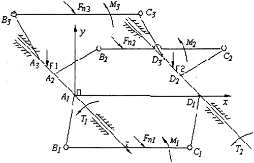 圖3.3是一多相并列雙曲柄機構(gòu)的結(jié)構(gòu)簡圖,曲柄軸為輸入軸,其上作用有已知外力F1和未知輸入力矩T1,曲柄軸為支撐軸,其上的外力知T2和外力F2以及作用在連桿B1C1上的合外力Fn1,外力矩M1都是已知的,在任一時刻t,連桿A1B1與XOZ平面的夾角為φ1,運用機構(gòu)靜態(tài)力學(xué)分析方法[22、29、30、34],對連桿B1C1可列出受力平衡方程: