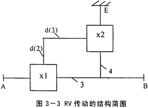 為計算RV傳動的傳動比,將上述的傳動簡圖用圖3-3所示的結(jié)構(gòu)簡圖代替。該機(jī)構(gòu)簡圖包括兩個簡單行星機(jī)構(gòu):x1和x2。輸出件A為中心輪1,輸出件B為輸出盤6,且有ω6=ω4。支承件E為針輪7,漸開線行星輪2與轉(zhuǎn)臂(曲柄軸)3均為輔助件d。
