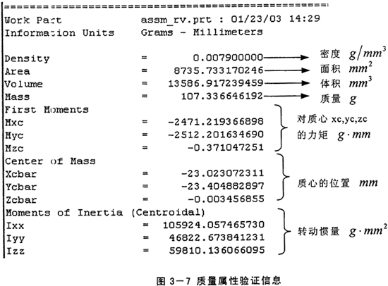 通過UG強(qiáng)大的質(zhì)量屬性檢驗功能,可獲得每個零件及整個模型的密度、體積、質(zhì)量和慣量等必要信息。上圖3-7是所獲得的擺線輪的相關(guān)信息。