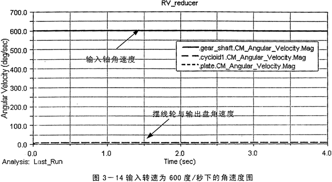 按RV減速器傳動比的理論計算公式i16=1+(z2/z1)Z7,由村課題所研究的RV減速器的參數(shù):Z2=34,Z1=10,Z7=30,計算得到總的傳動比為103,而由仿真得到的傳動比在圖3-8中為i=3000/29.12=103.02,在圖3-9中為i=600/5.829=102.93,且圖中擺線輪與輸出盤的角速度相等說明輸出部分施加的約束滿足等角速度輸出原理。