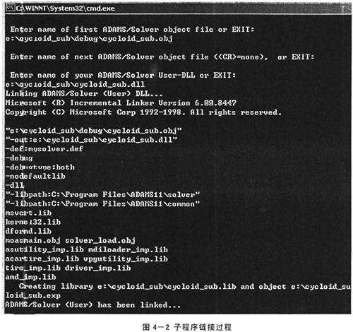 5)在背景模式(即命令提示模式)下,將上一步的目標(biāo)文件與ADAMS鏈接,生成可執(zhí)行的用戶庫(*.dll)。