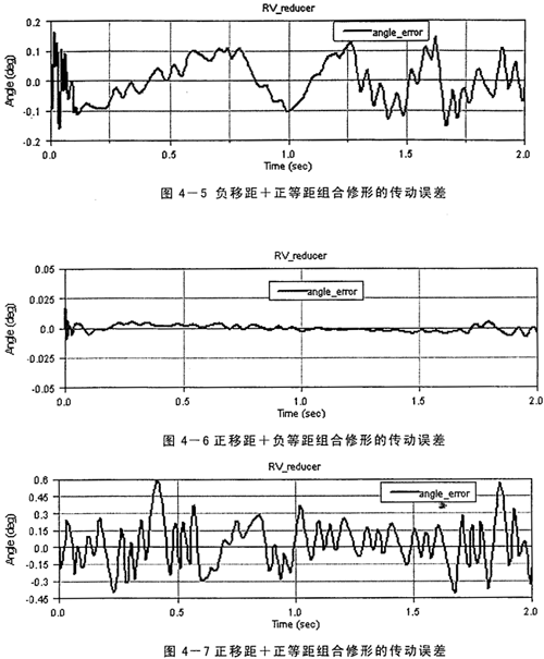 其中,θer——角度運動誤差,θin——任意時刻輸入軸轉(zhuǎn)角,i——傳動比,θout——輸出軸轉(zhuǎn)角。由于加工誤差、輪齒修形的原因引起瞬時傳動比的變化,必然出現(xiàn)傳動誤差,產(chǎn)生運動的不平穩(wěn)性。在RV減速器中,漸開線齒輪嚙合在前級,后級是擺線針輪傳動,由于后級的傳動比一般約是前級的4~30倍,前級的漸開線齒輪的傳動誤差將被縮小同樣的倍數(shù)后輸出,所以其傳動誤差關(guān)鍵取決于后級的擺線針輪的嚙合誤差,而實際工作中擺線輪的修形方式及修形量的選擇是影響擺線針輪的嚙合誤差很大的因素。因此本課題中僅研究了輪齒修形對傳動誤差的影響,所采用的修形量以及得到的傳動誤差大小如表4-1所示,限于篇幅,對于負(fù)移距+正等距、正移距+負(fù)等距和正移距+正等距組合修形的傳動誤差仿真結(jié)果曲線各只列出一組(圖4-5、4-6、4-7)。